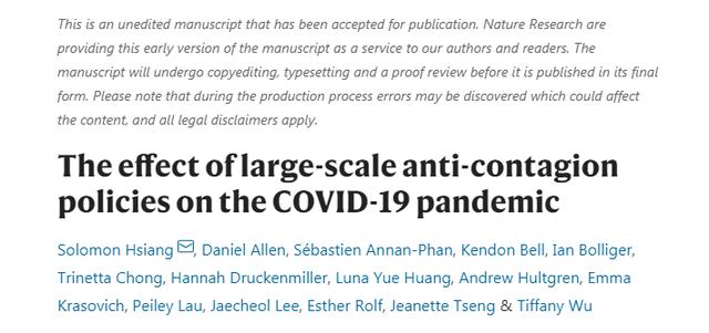 原文出處:Hsiang, S., Allen, D., Annan-Phan, S. et al. The effect of large-scale anti-contagion policies on the COVID-19 pandemic[J]. Nature (2020). https://doi.org/10.1038/s41586-020-2404-8.